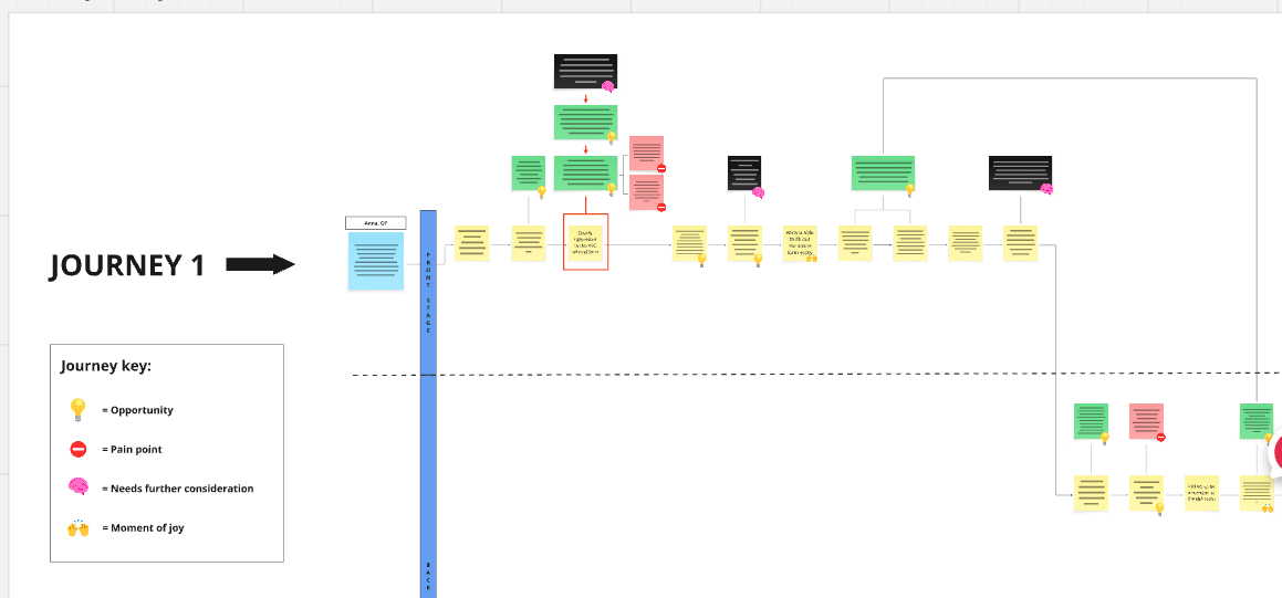 Mapping the end-to-end journey: Working closely with ASC staff, I mapped out how the initial assessment service - referred to as the ‘front door’ - actually operates from start to finish. This meant looking at where online and offline interactions connect, how data moves through the system, which tools and platforms are used, and where staff have to step in manually to keep things moving. Laying this out clearly made it much easier to spot inefficiencies and pinpoint where the experience could be improved for both residents and staff.
