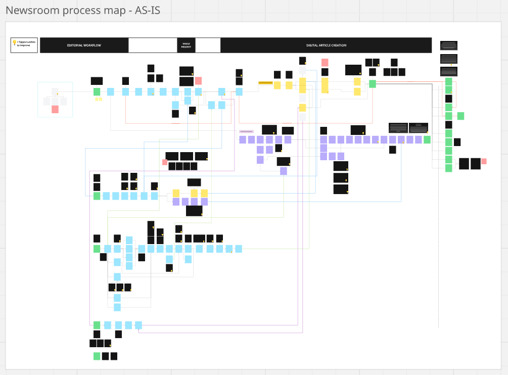 Current state process maps: Visual maps of how work currently flows through the newsroom, making the complexity and inefficiencies easy to see at a glance. These were designed as a practical starting point for redesigning workflows, and included a clear view of where outdated and paper-based tasks could be replaced with smarter digital solutions.